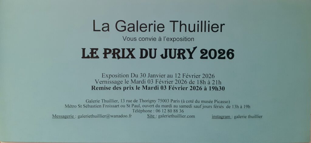 Venez découvrir la toile que je propose pour le prix du Jury 2026 à la galerie Thuillier du 30 Janvier au 12 Février – Vernissage le Mardi 3 Février de 18h – 21h- Remise des prix Mardi 3 Février à 19h30 .