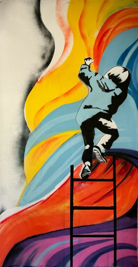 Enkye joue aux dés Pigments minéraux sur toile – 2m x 4m Hommage à Shrödinger Pigments minéraux sur toile – 2m x 1.6m INTRICATION SPATIO-TEMPORELLE Street Art à Paris – Intrication Spatio-temporelle – Juillet 2024 Intrication spatio-temporelle – Bombe à eau/pochoir sur toile 2mx1.1m